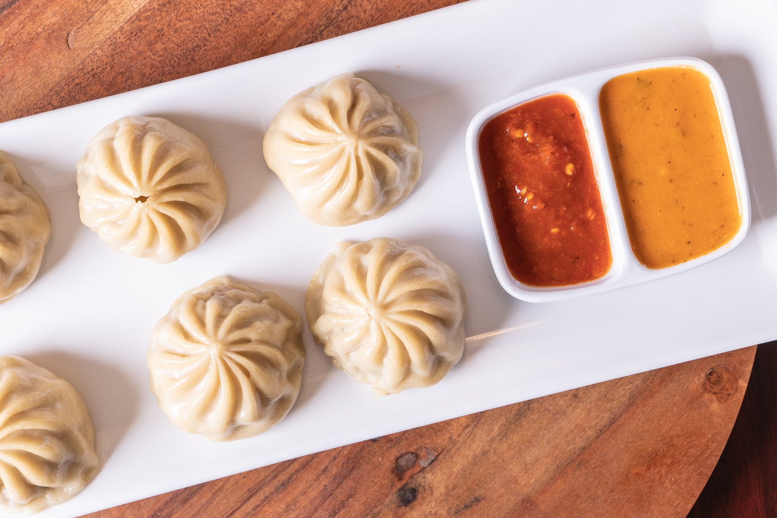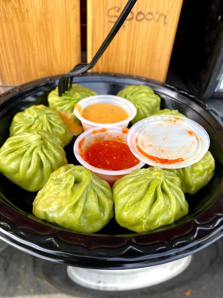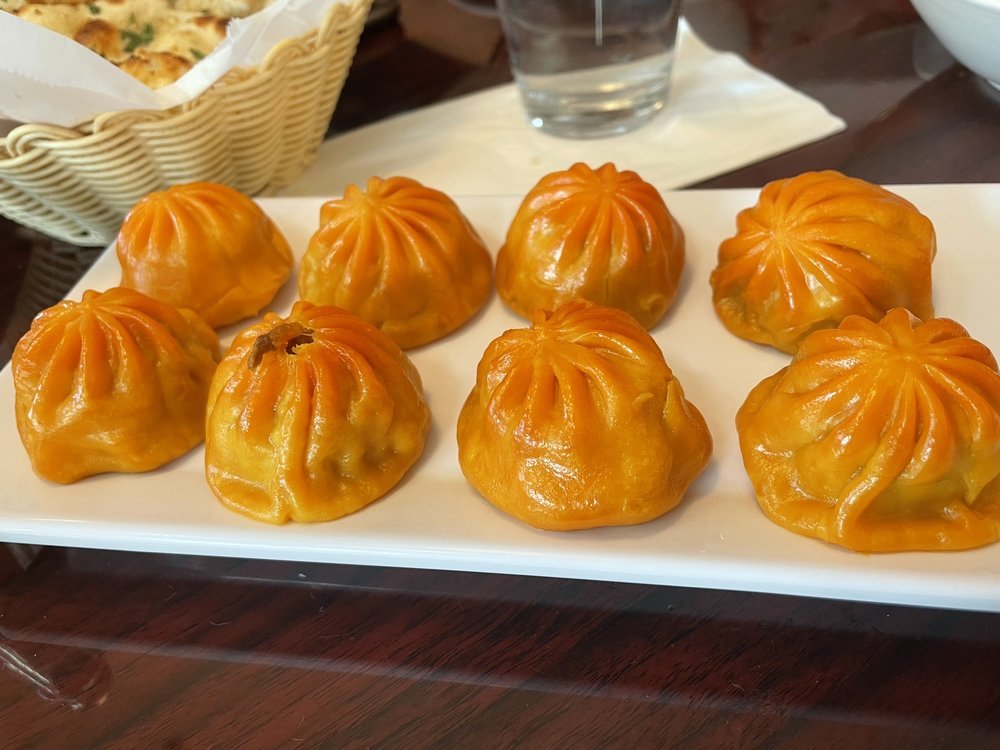 Homemade and wrapped Nepalese potstickers filled with chicken in chicken momo and seasoned with imported Himalayan spices.